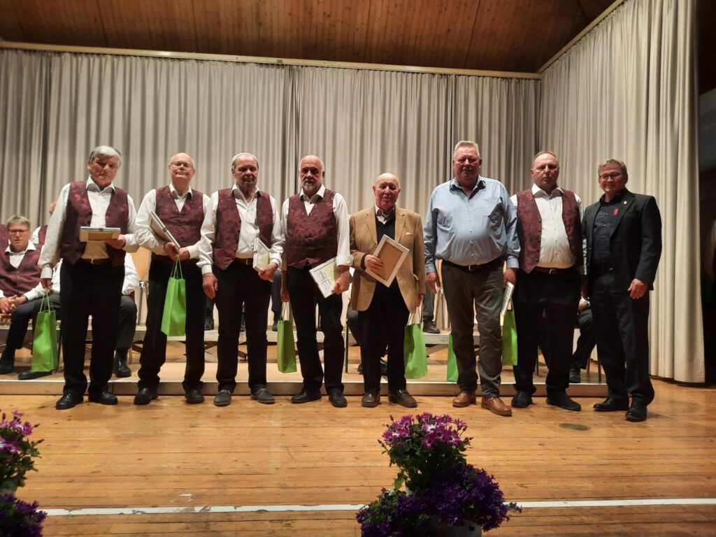 Dann folgten auch schon die Ehrungen. Für 60 Jahre aktives Singen wurde Albert Walter geehrt. Für 50 Jahre aktives Singen erhielten Kurt Bausch und Hans Bulling die Ehrung vom Chorverband Friedrich Silcher. Auch vom Verein erhielten die drei Jubilare eine Auszeichnung. Für 60 Jahre passive Mitgliedschaft erhielt Hans Ehret eine Urkunde vom Verein.
